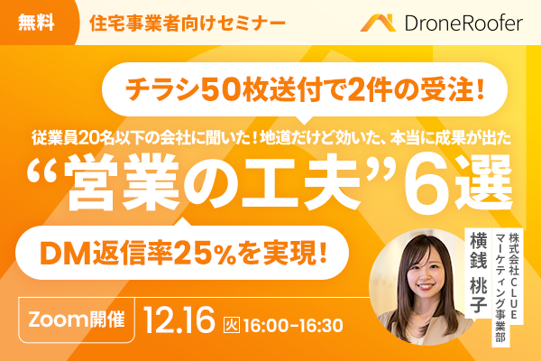 本セミナーでは、従業員20名以下の住宅・塗装・工務店などの事業者様が、実際に取り組み、本当に成果が出た“営業の工夫”6つをご紹介します。・返信率25%を実現した、定期点検DMの工夫