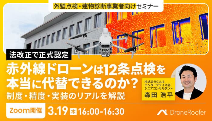 2022年4月の法改正により、一定要件を満たす赤外線ドローン調査は、12条点検において打診同等以上の精度を持つ手法として正式に認められました。足場不要によるコスト削減や工期短縮、安全性向上を背景に導入は加速しています。 一方で、「本当に精度は担保できるのか」「住宅密集地でドローン飛行できるのか」といった疑問も少なくありません。 本セミナーでは、制度背景と精度、法令を整理したうえで、打診との関係や導入モデルを解説。単なる技術紹介ではなく、「どう設計すれば現場で成立するのか」という実装視点からお伝えします。こんな方におすすめ