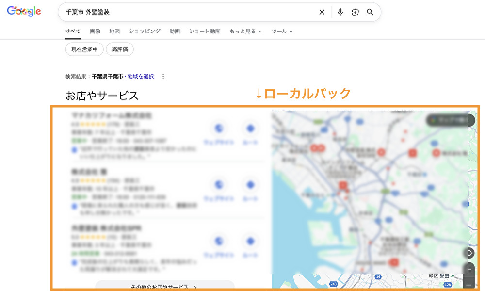 お施主様は多くの場合、「〇〇市 外壁塗装」といったキーワードで検索します。その際、検索結果の最も目立つ場所に表示されるのが、地図と共に表示される3社程度の店舗情報、通称「ローカルパック」です。