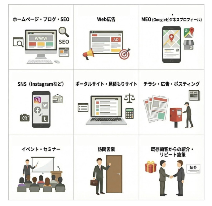 ここからは、顧客がリフォーム会社を選ぶ際の情報源を踏まえながら、代表的な集客手法を9つ紹介し、それぞれのメリット・デメリットやターゲット別に最適な活用方法を解説します。
