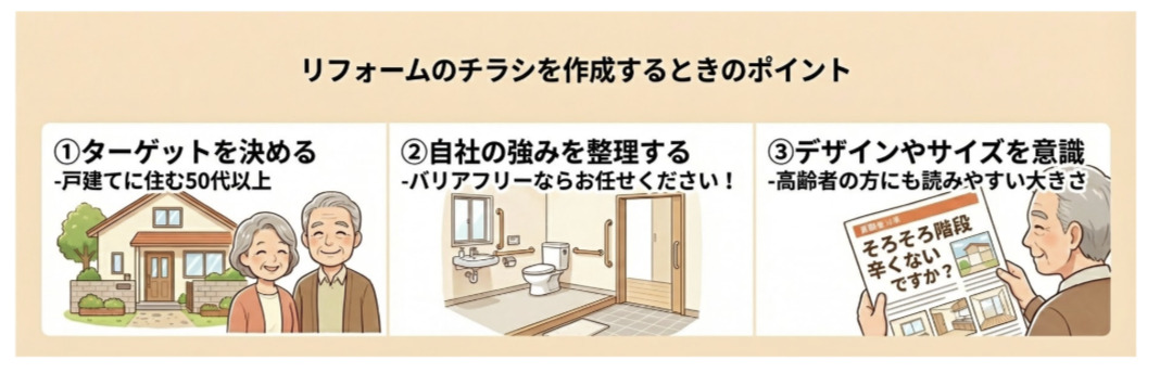 リフォームのチラシで集客を成功させるには、ただ配るのではなく、正しいやり方が大切です。まず「誰に、何を届けたいか」というターゲットをハッキリ決めましょう。チラシは、地域を絞って配れるだけでなく、高齢者の方など、インターネットをあまり使わない人にも確実に情報を届けることができるのが大きな強みです。
