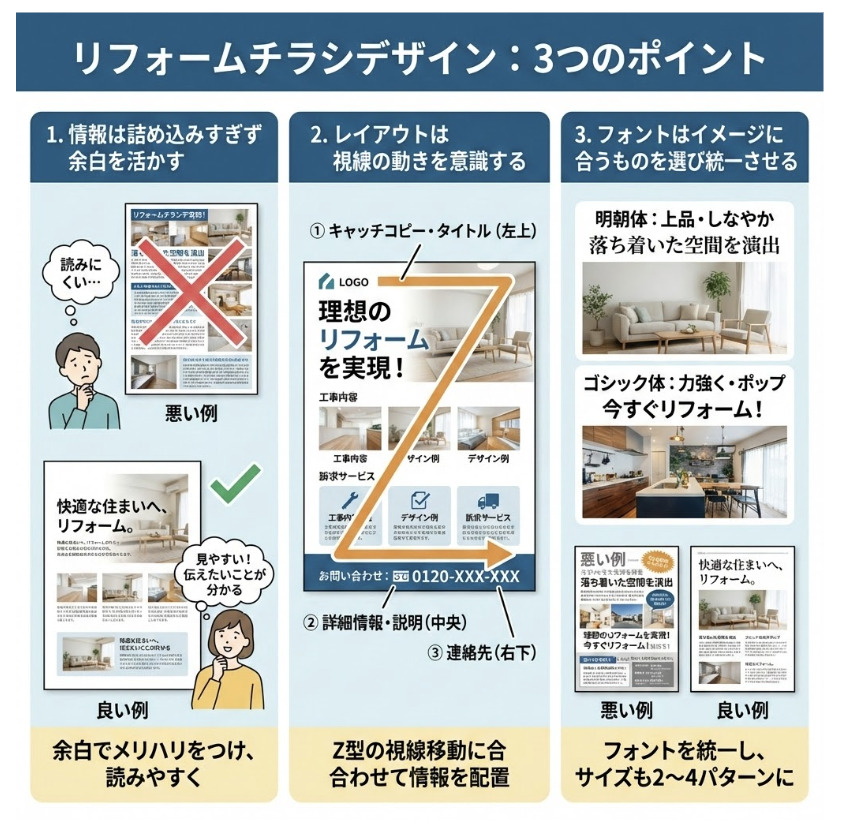 先述した「デザインを意識する」とは、具体的にどういうことなのでしょうか。ここからは、リフォームのチラシデザインで気をつけたい3つのポイントについて解説します。
