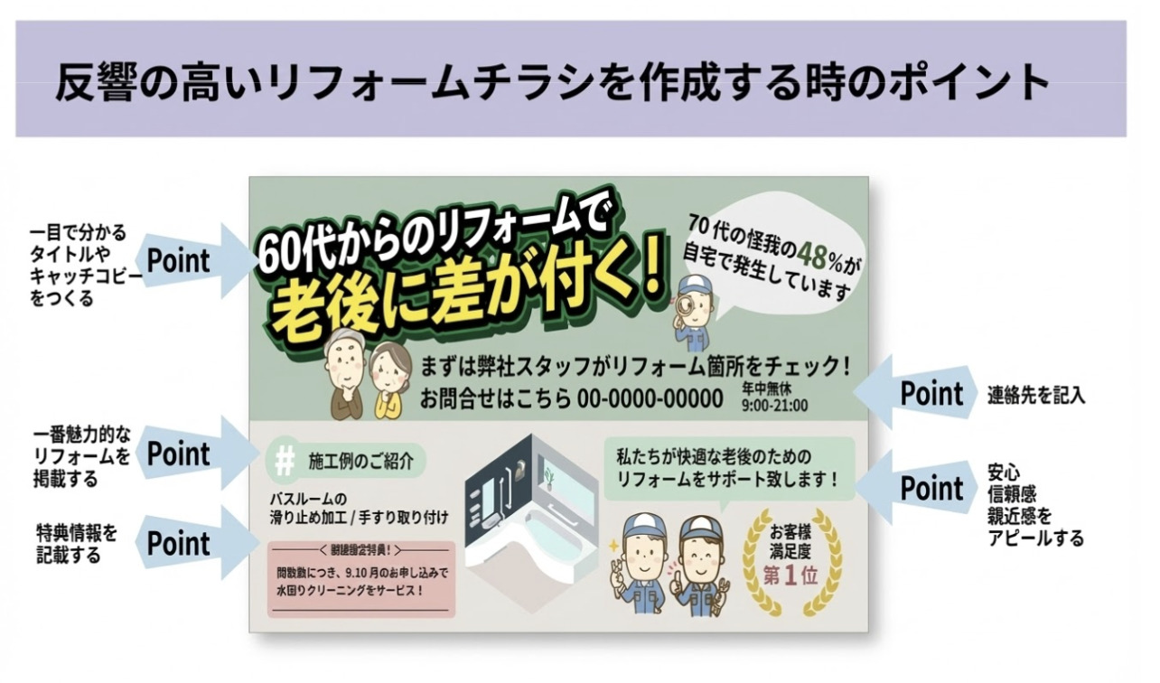 リフォーム集客で成果を上げるには、チラシを「作って配る」だけでは成果は見込めません。反響率を高めるには、「誰に・何を伝えるか」が明確なチラシ設計と、効果的に配布をしていくことが重要です。
