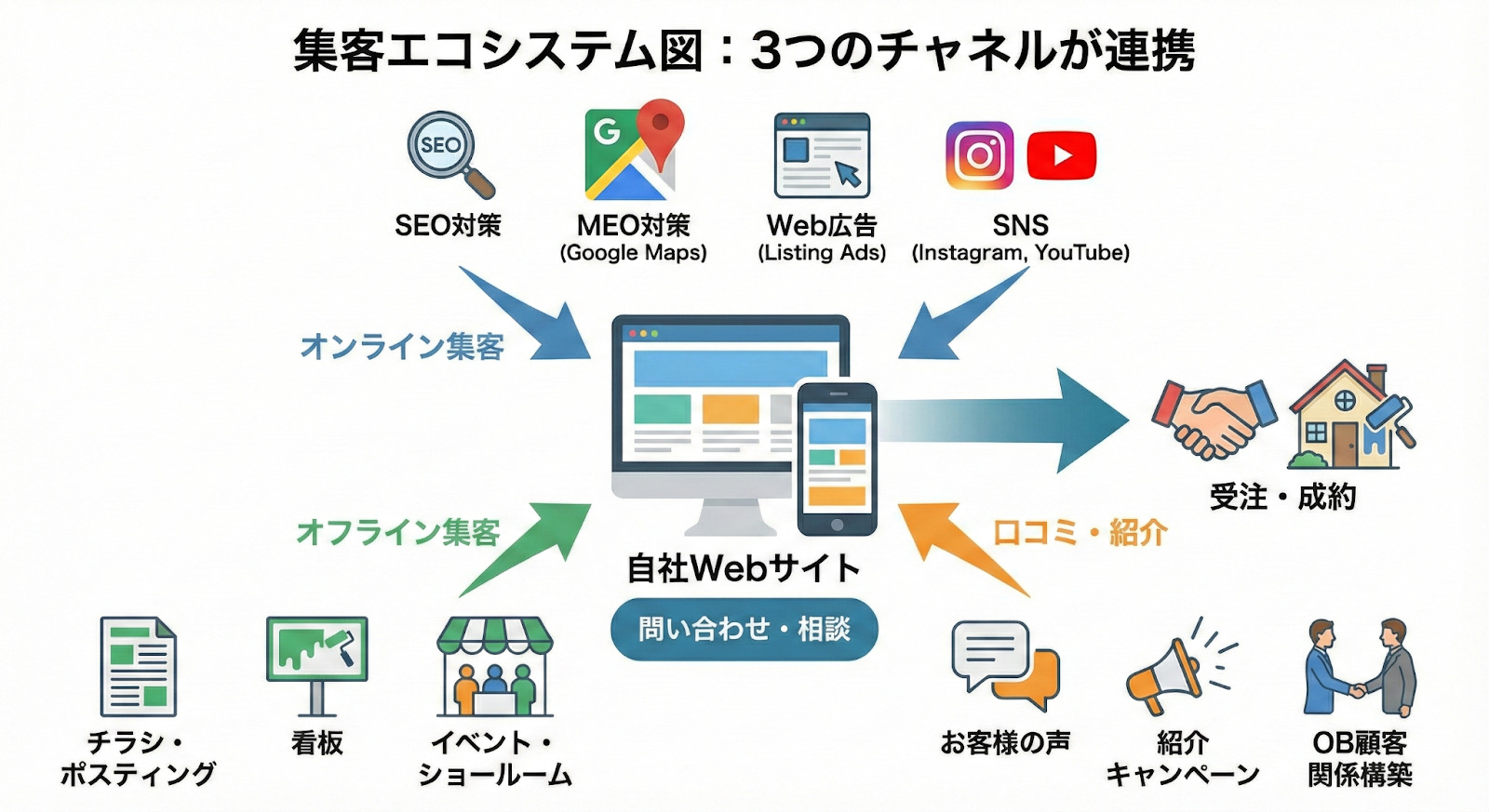 塗装会社の集客施策は、大きく3つのチャネルに分類できます。自社の状況に合わせて、これらの施策をバランス良く組み合わせることが成功のポイントです。