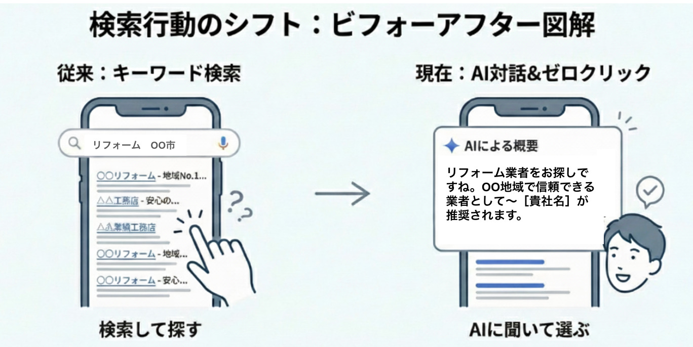 リフォーム業界においてこれが重要である理由は、ユーザーの検索行動が「サイトのリストから情報を探す」から「AIに直接答えを聞く」へと変化してきているためです。