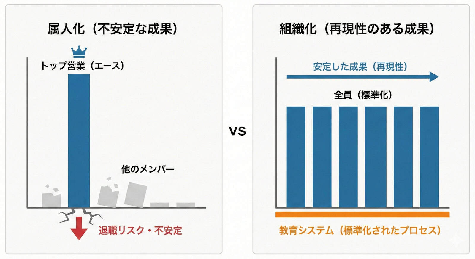 トップ営業の成功法則が言語化されず、「暗黙知」のままになっているため、若手が学ぶべき具体的な「型」が存在しません。その結果、個人のセンスに頼った営業になりやすく、成果が安定せず、再現性のある改善が回りにくくなります。