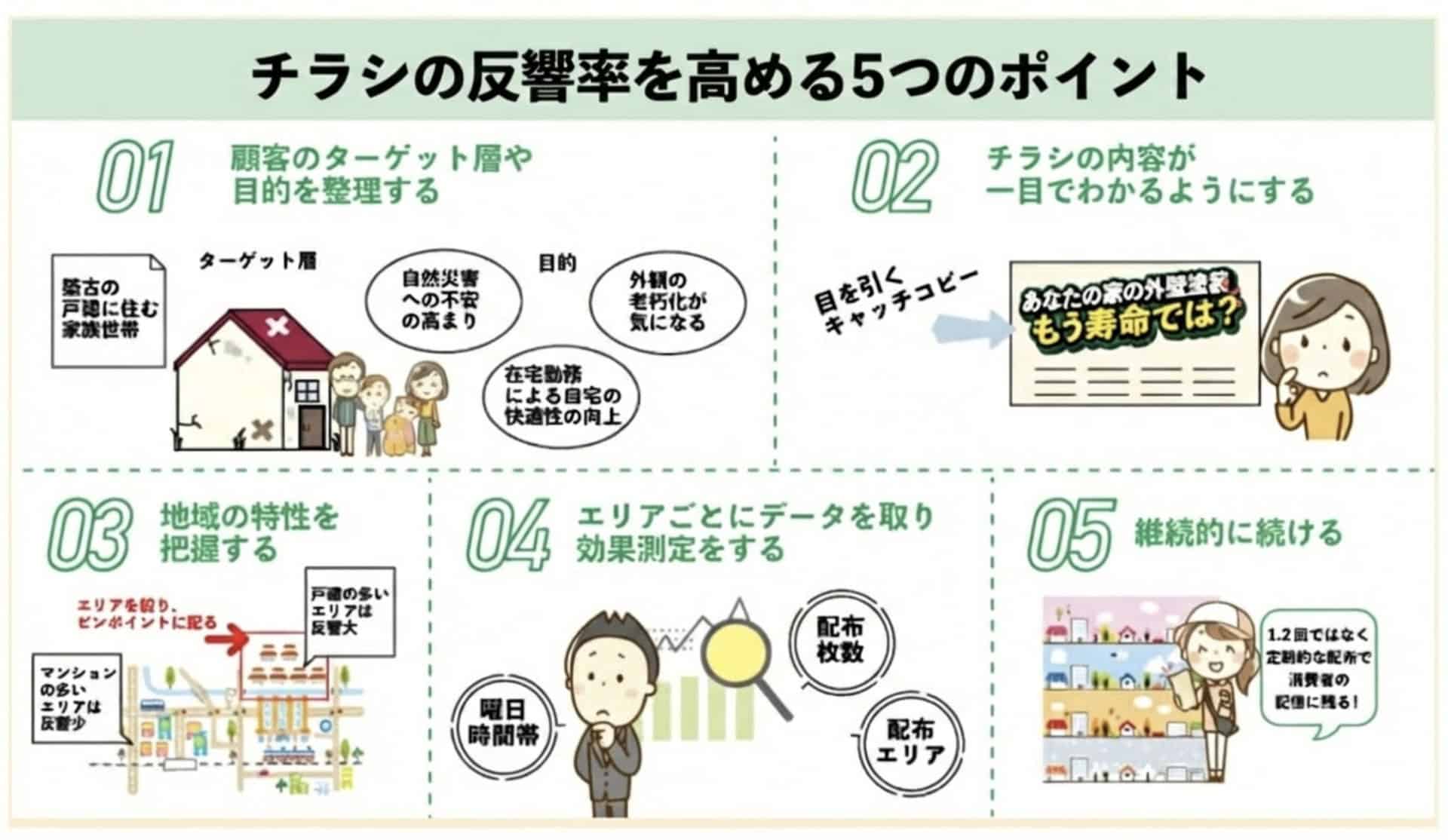 外壁塗装チラシの反響率を高めるには、チラシの内容だけでなく、配布方法や継続性なども重要です。以下の5つの取り組みが成果につながりやすくなります。